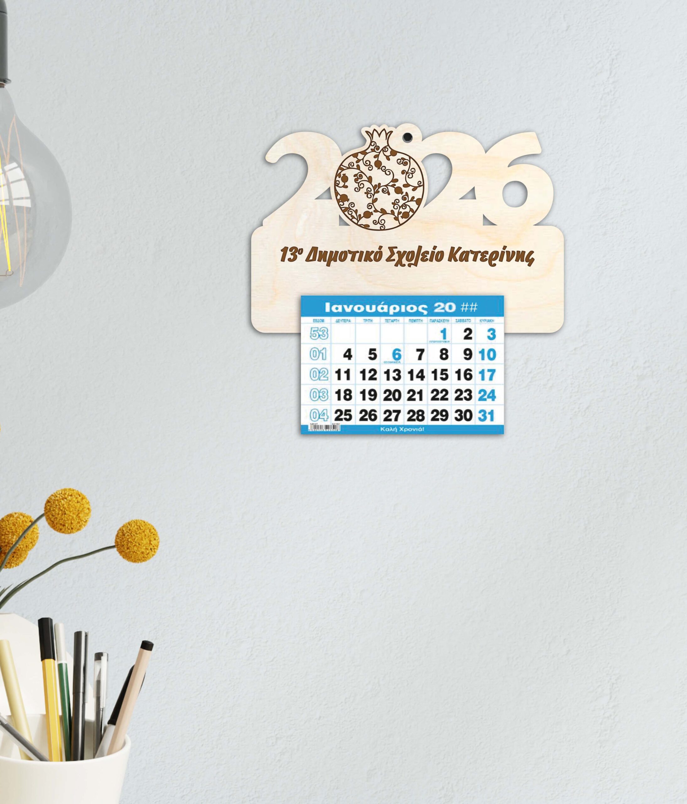 Ξύλινο Ημερολόγιο 2026( ρόδι σχέδιο)