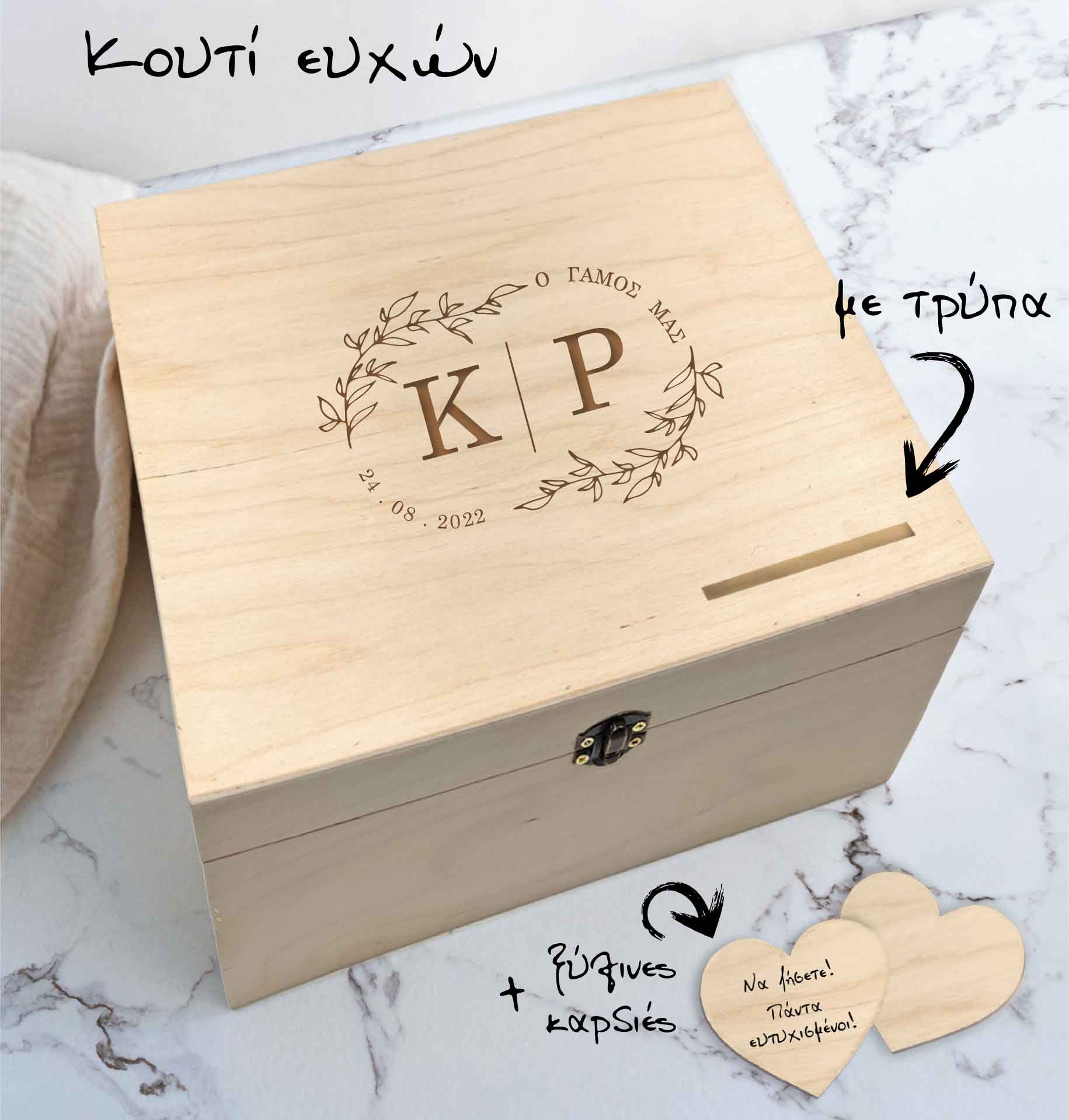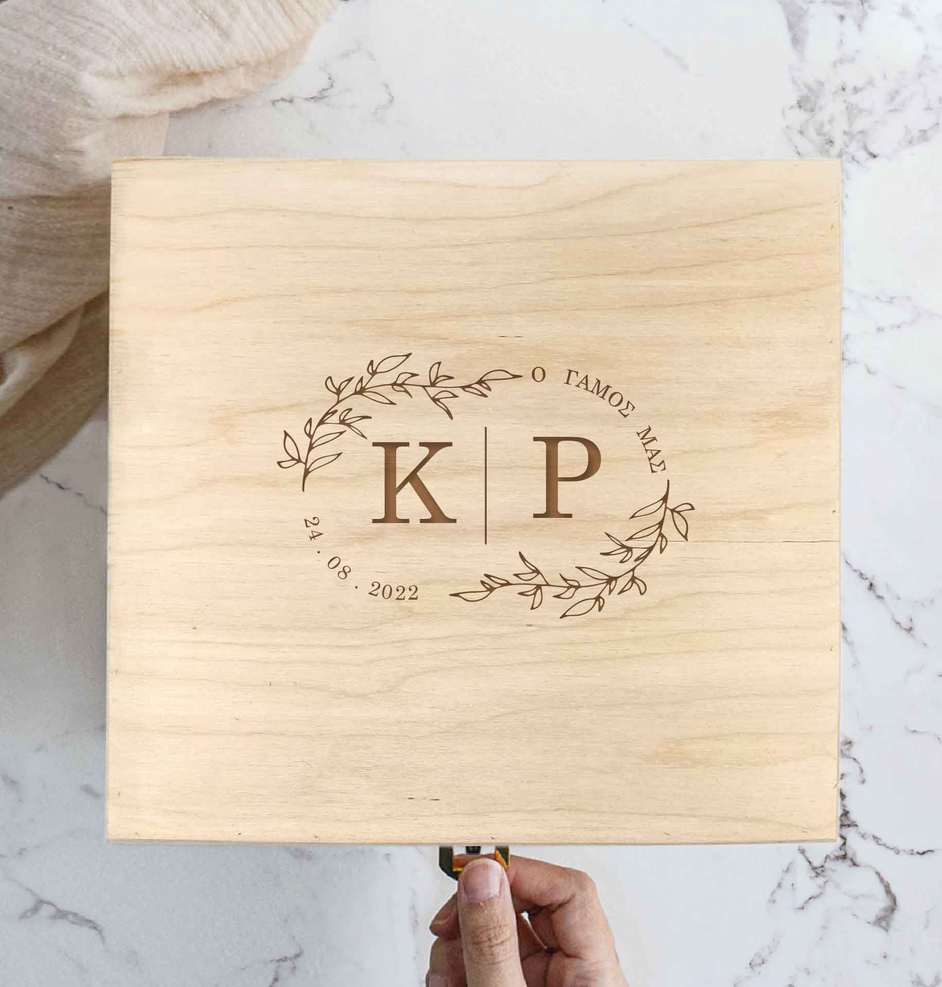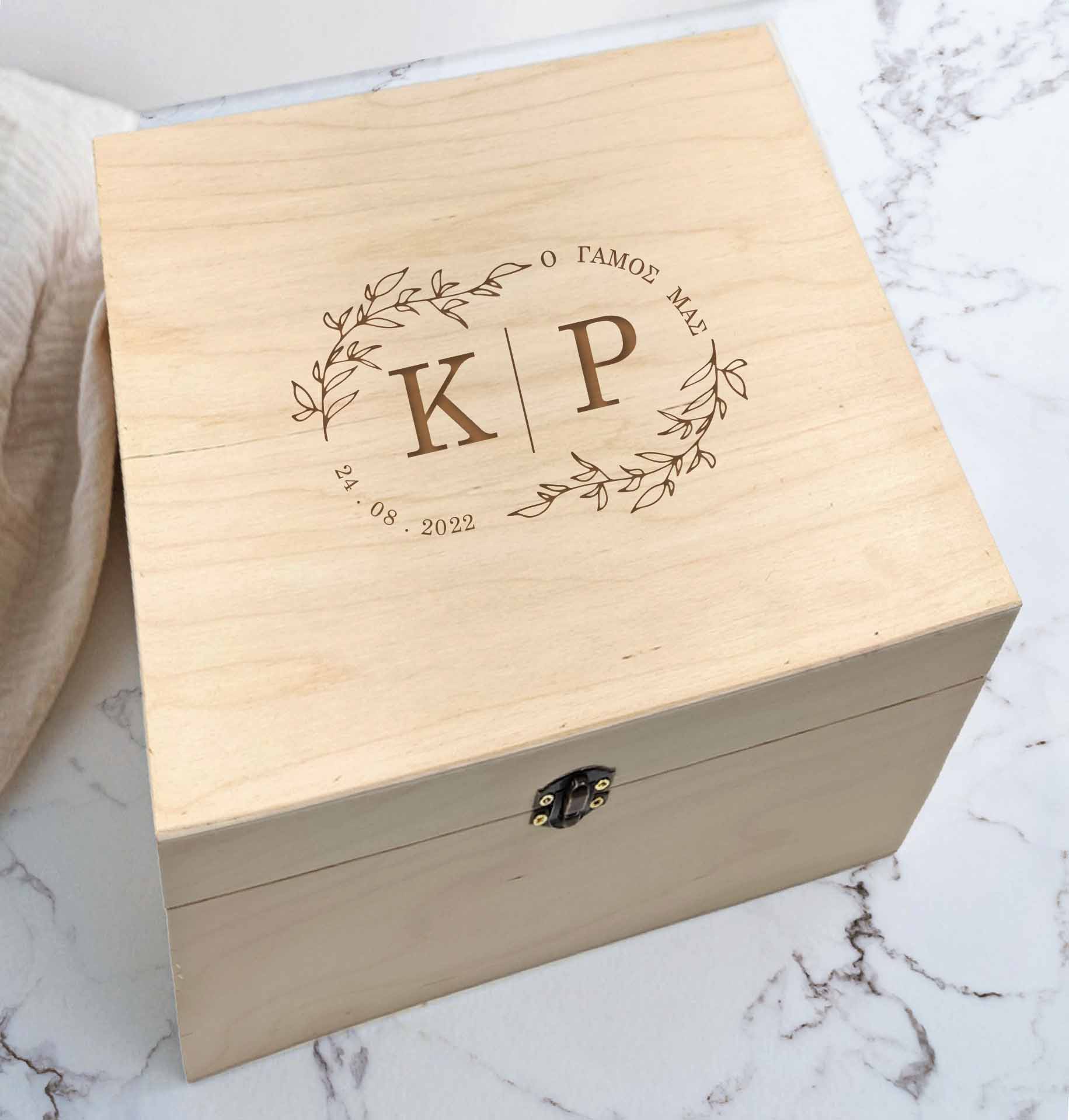 Χειροποίητο ξύλινο κουτί, ιδανικό για να κρατήσετε ζωντανές τις πιο όμορφες αναμνήσεις του γάμου σας. Ένα κομψό και διαχρονικό αντικείμενο, με δυνατότητα προσωποποίησης με ονόματα, ημερομηνία ή δικό σας μήνυμα.